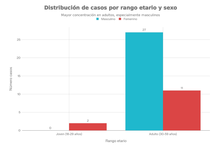 - Adulto (30-59 años): Masculino (27), Femenino (11)